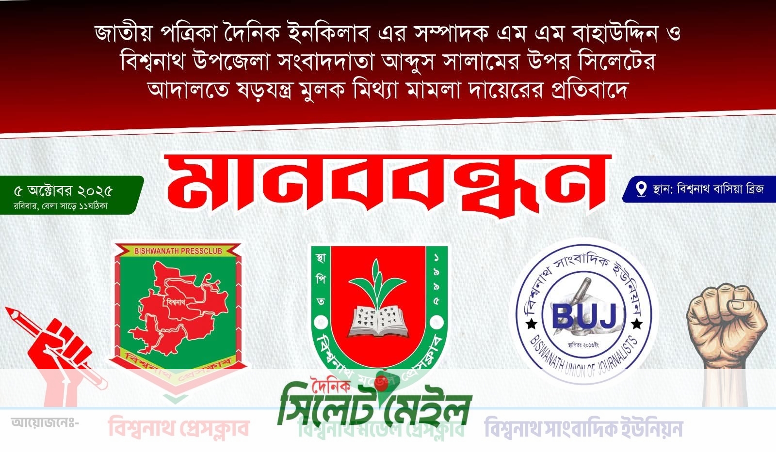 আদালতে ষড়যন্ত্রমুলকভাবে মিথ্যা মামলা দায়েরের প্রতিবাদে মানববন্ধন কর্মসূচির ডাক দিয়েছে বিশ্বনাথের সাংবাদিক সংগঠন যথাক্রমে বিশ্বনাথ প্রেসক্লাব, বিশ্বনাথ মডেল প্রেসক্লাব ও বিশ্বনাথ সাংবাদিক ইউনিয়ন।আগামী রোববার সকাল ১১টায় বিশ্বনাথ পৌর শহরের বাসিয়া ব্রিজের উপর এই কর্মসূচি পালন করা হবে।