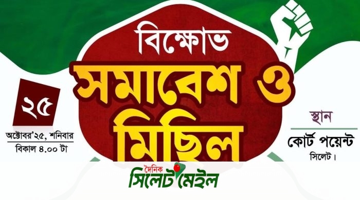 বিক্ষোভ মিছিল সমাবেশ শনিবার জুলাই জাতীয় সনদ বাস্তবায়ন আদেশ জারি ও উক্ত আদেশের উপর আগামী নভেম্বরের মধ্যে গণভোট আয়োজনসহ ৫ দফা গণদাবি আদায়ের লক্ষ্যে সিলেটে বিক্ষোভ কর্মসূচী ঘোষণা করেছে সিলেট